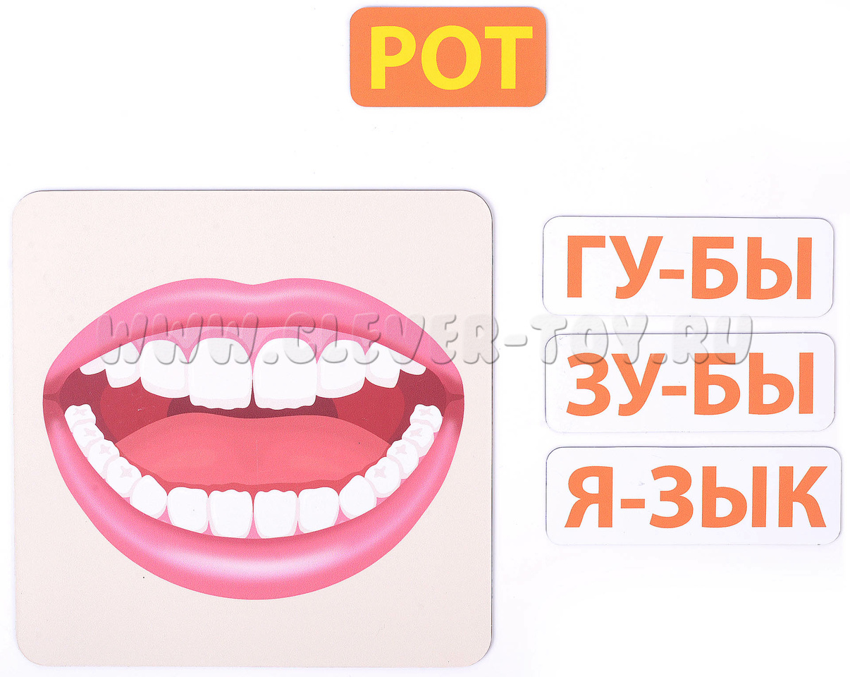 В наборе 88 магнитных карточек трёх видов: плакаты с изображением тела или его частей (сами служат магнитной основой); названия, разбитые по слогам; внутренние органы (знакомим с ними постепенно, по возрасту).