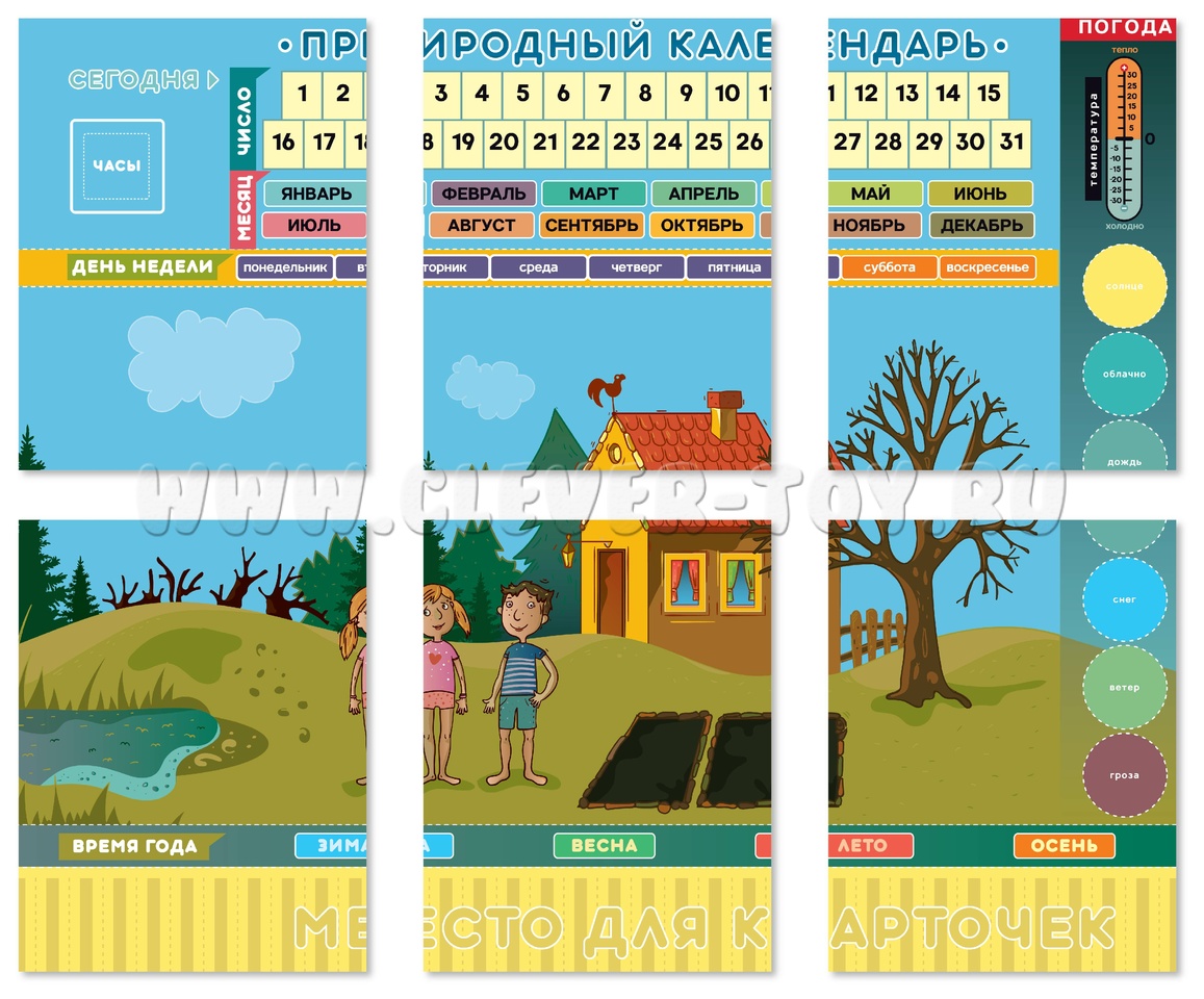 Дети с радостью будут использовать магнитные маркеры для обозначения времени года, месяца, дня недели, числа, часов и минут. Они также смогут указывать температуру на термометре и работать с карточками, которые представляют признаки весны, лета, осени или зимы.