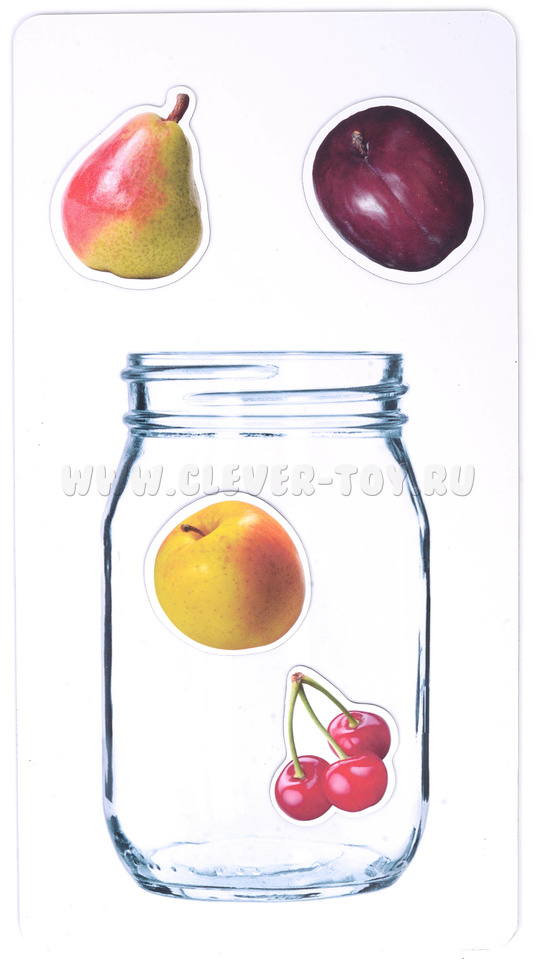 Пособие открывает множество возможностей для развития. Яркие картинки помогают запоминать названия фруктов и овощей и различать их по цвету, а после сортировки можно посчитать, сколько плодов оказалось в корзинке или сколько овощей поместилось в банке, так карточки превращаются в удобный счётный материал. Работа с элементами разного размера развивает восприятие пропорций и сенсорные навыки.