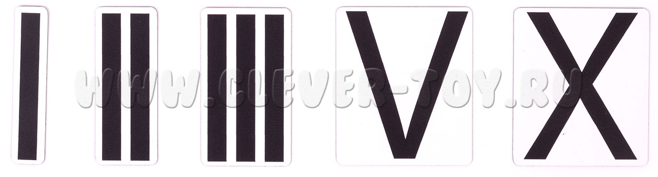 В наборе 40 карточек. Высота карточек: 7 см. I - 8 штук; II - 4 штуки; III - 4 штуки; V - 10 штук; Х - 14 штук.