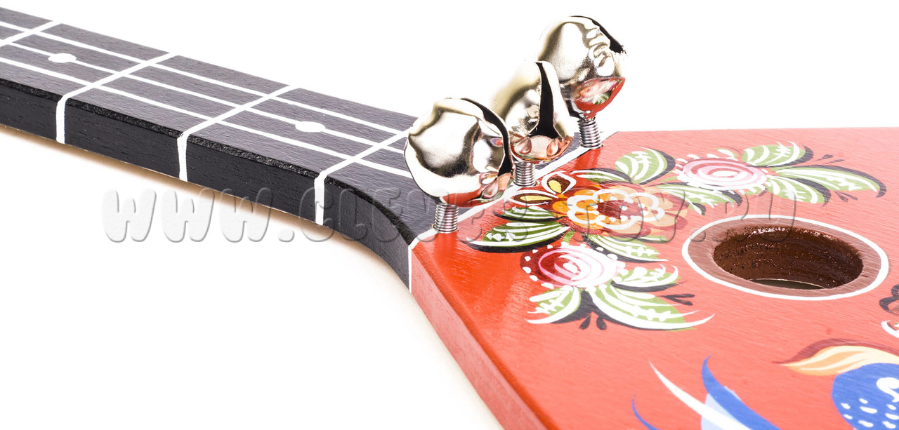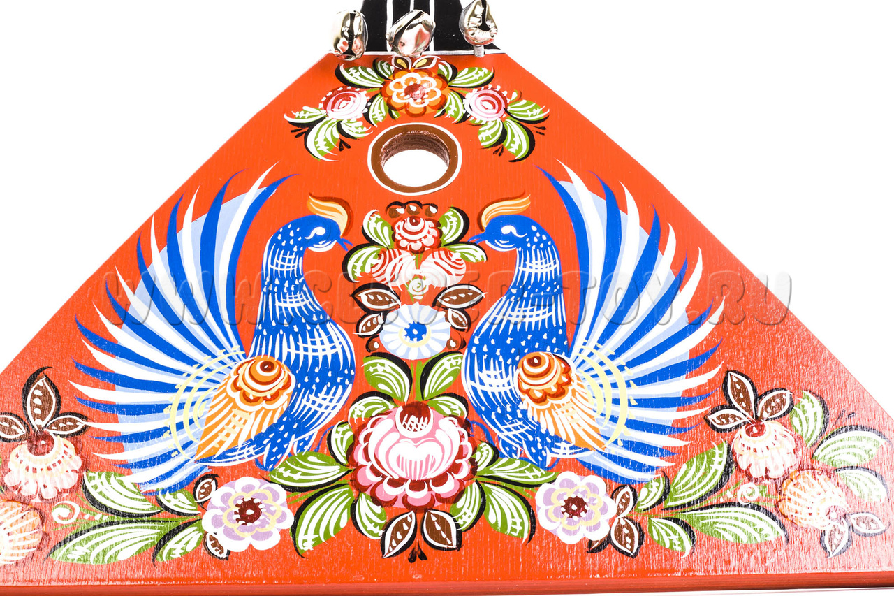 Балалайка детская выполнена из фанеры толщиной 8 мм. На лицевой стороне инструмента нанесена городецкая роспись. В районе грифа располагаются три бубенца, крепление струн не предусмотрено.