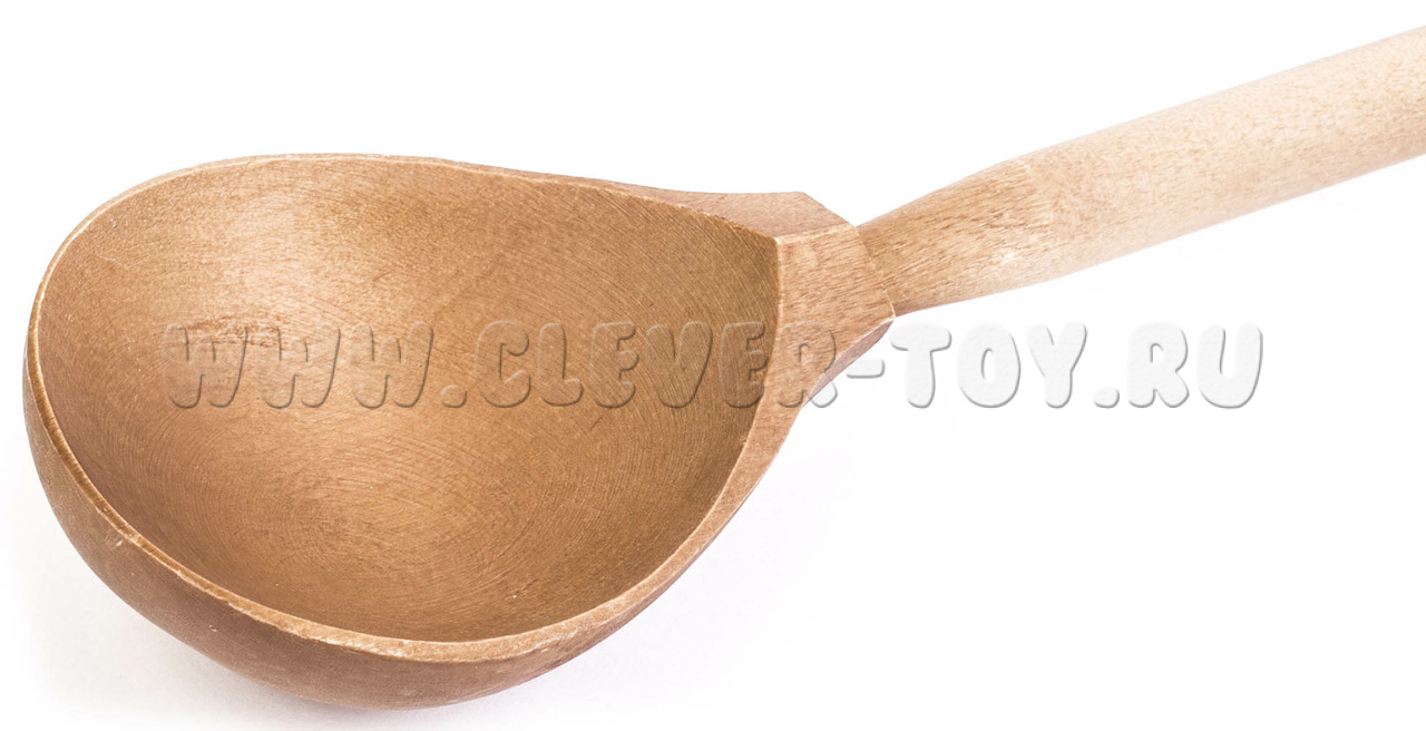 Размеры: диаметр черпака 65 мм, длина черенка 30 см. Черенок и черпак соединяются клеем. Ложка выполнена на станке. Материал: береза.