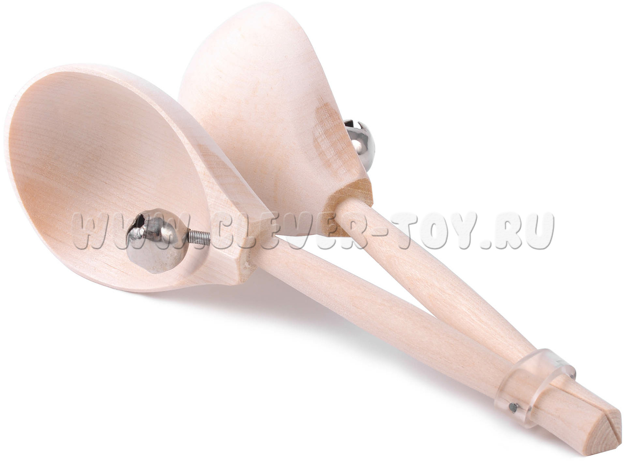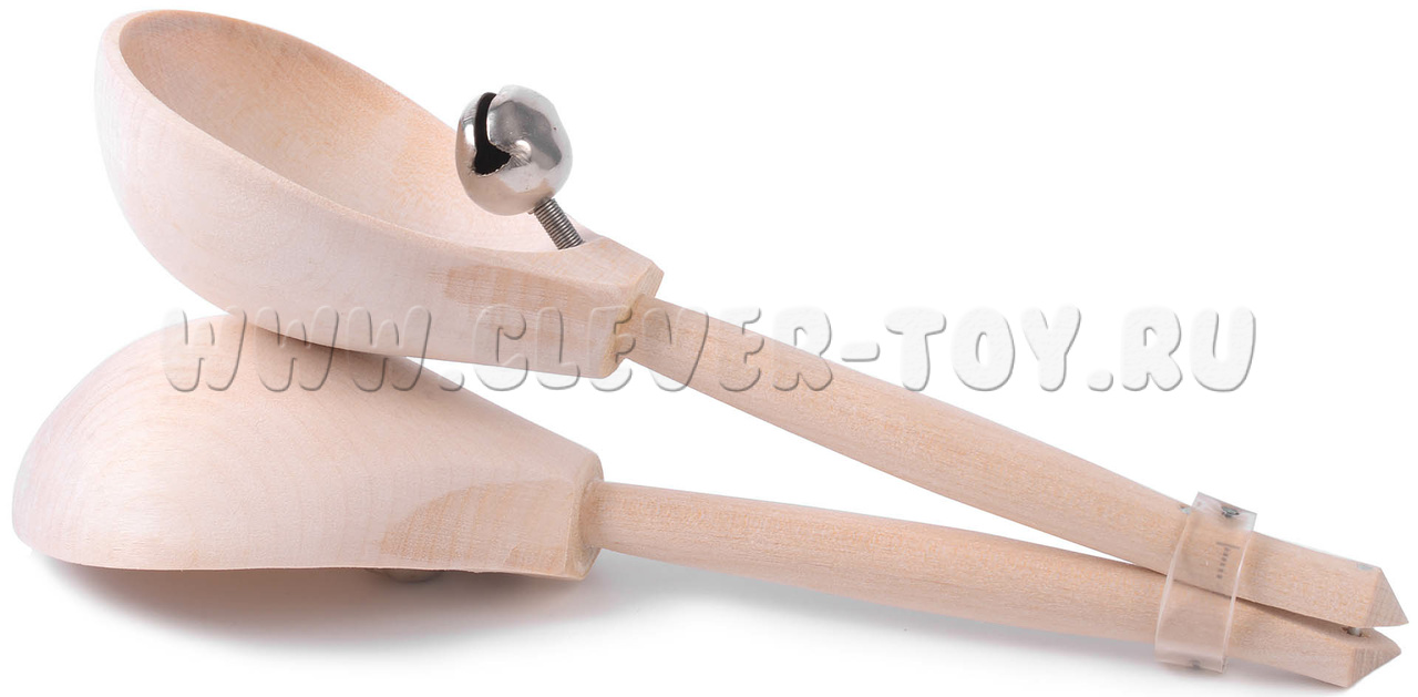 Две деревянные ложки соединены вместе с помощью хлорвинилового кольца диаметром 20 мм. Хвостовики черенков сточены под углом в 45 градусов. В задней части черенков вмонтирован скрытый шип. В каждый из черпаков с наружной стороны вклеено по одному бубенчику. Материал: береза.