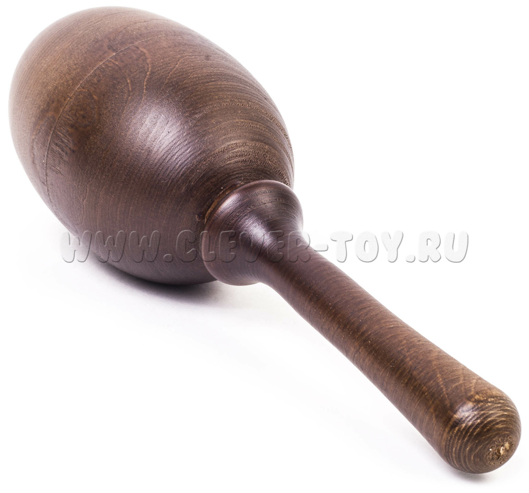 Погремушка представляет собой пустотелый деревянный предмет яйцеобразной формы. Внутрь погремушки засыпана охотничья дробь. В нижней части погремушки крепится фигурная ручка токарной работы. Материал: липа.