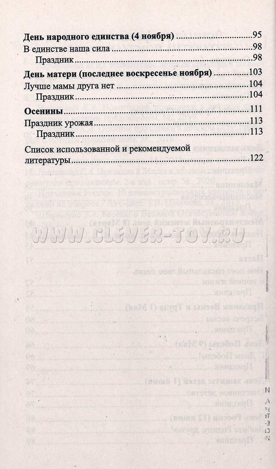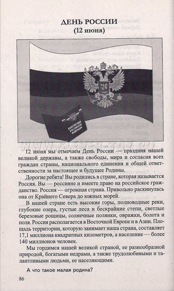 Отличительной чертой издания, является наличие для педагогов детских садов сценария праздника "Любите Родину, друзья", после которого предлагается провести увлекательную викторину для закрепления материала. Ведущий дает возможность детям ответит на такие вопросы: "Когда празднуют День России?", "Знаете ли вы слова гимна России?".