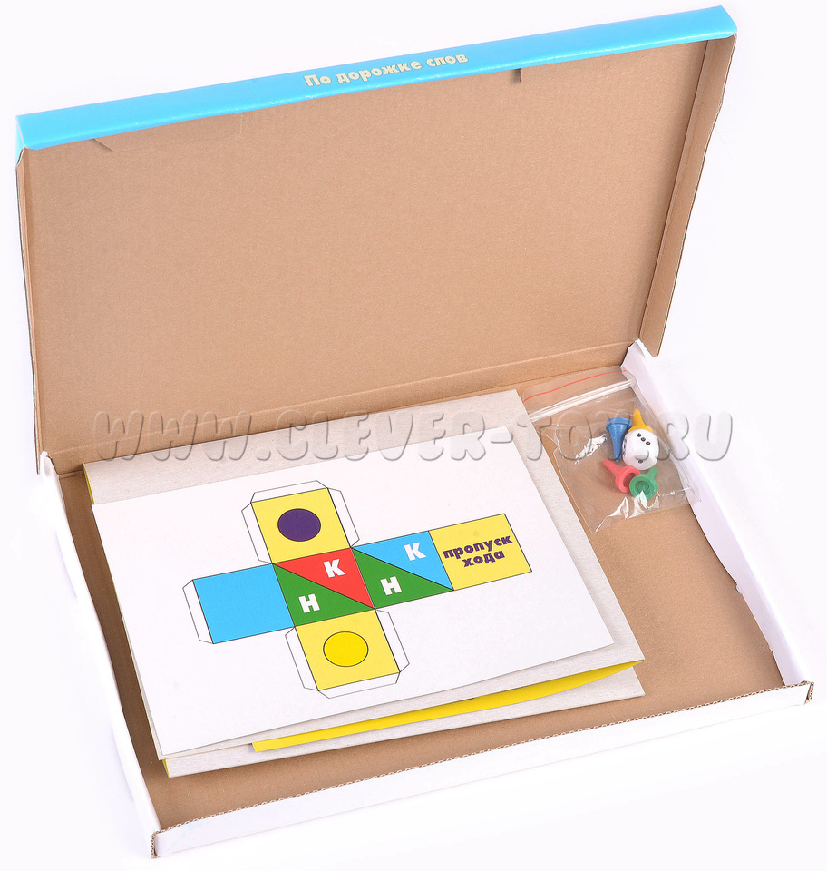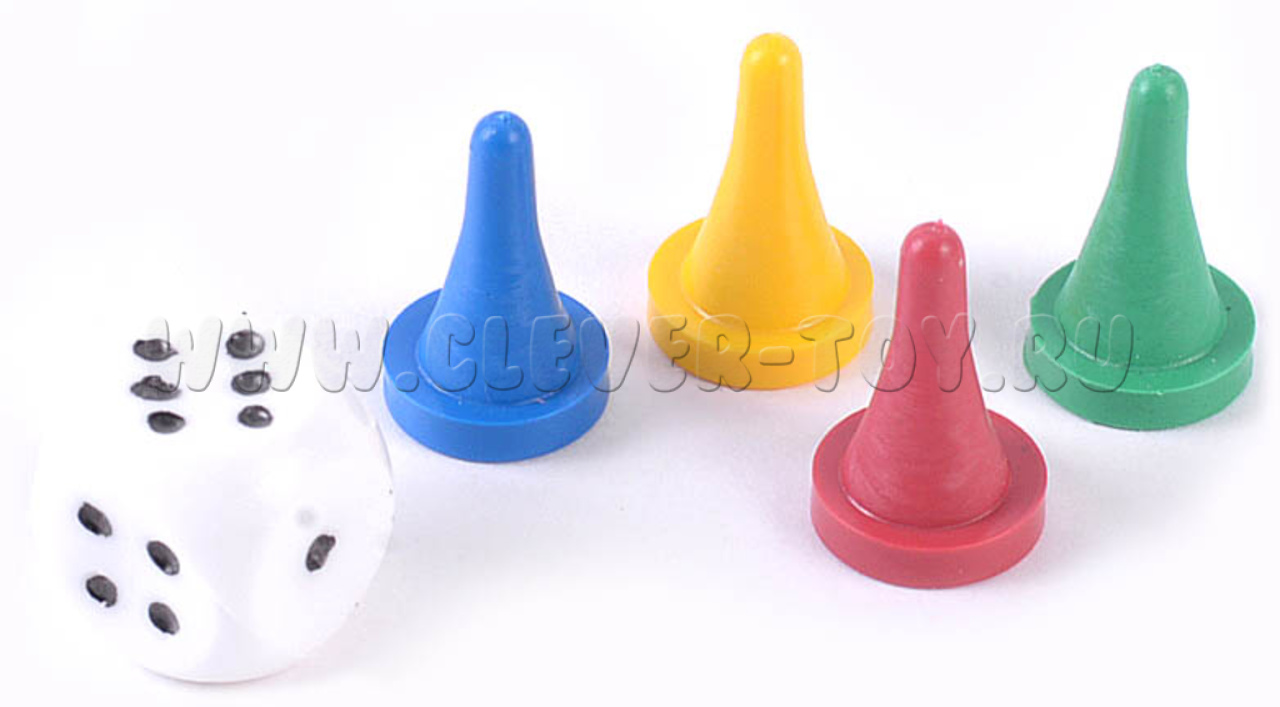 Состав набора: игровое поле формата А3, развертка бумажного кубика, пластиковый кубик, 4 цветные фишки.