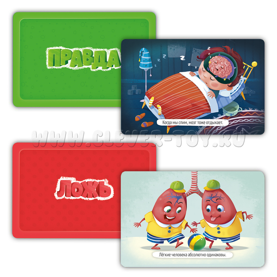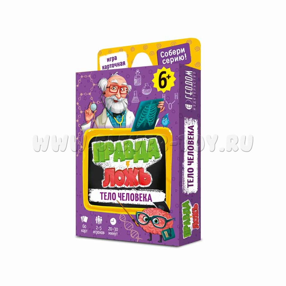 Эта карточная игра – находка для любознательных детей и их родителей! На карточках 50 интересных фактов о теле человека и великолепные иллюстрации с юмором. Задача - разобраться, где правда, а где ложь.