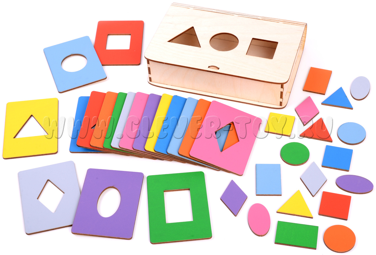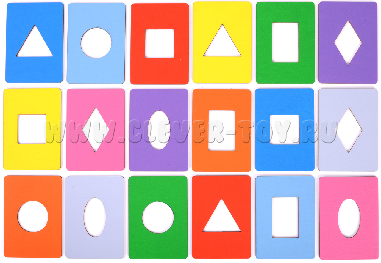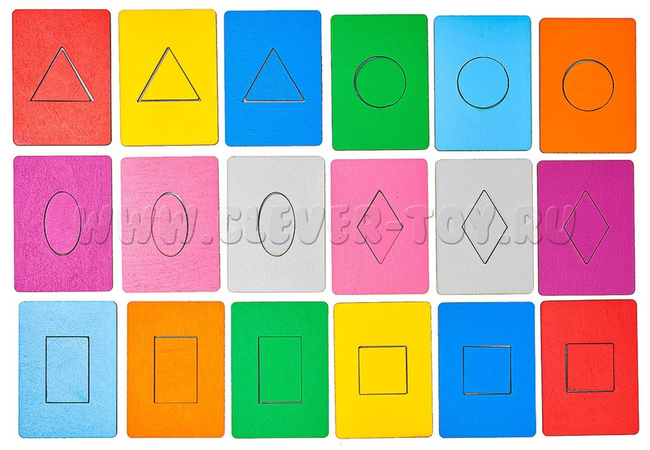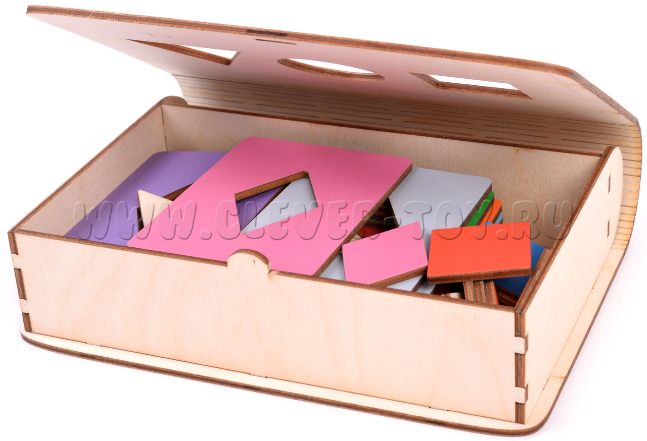В комплект входят 18 планшеток с выемками в виде квадратных, овальных, круглых, прямоугольных, ромбовидных и треугольных форм.