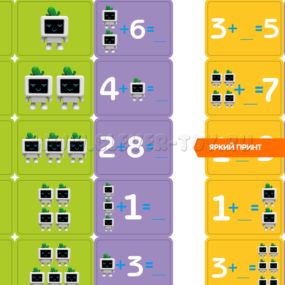 Зеленые карточки – начальный уровень. Ребенок изучает цифры. Положив на одну чашу весов цифру, ребенок должен найти баланс, с помощью такого же равного цифре количеству роботов.