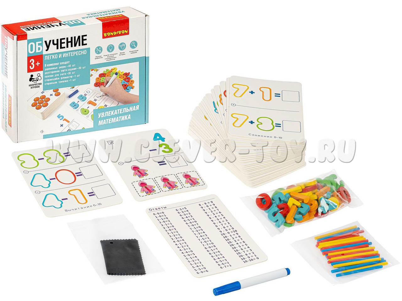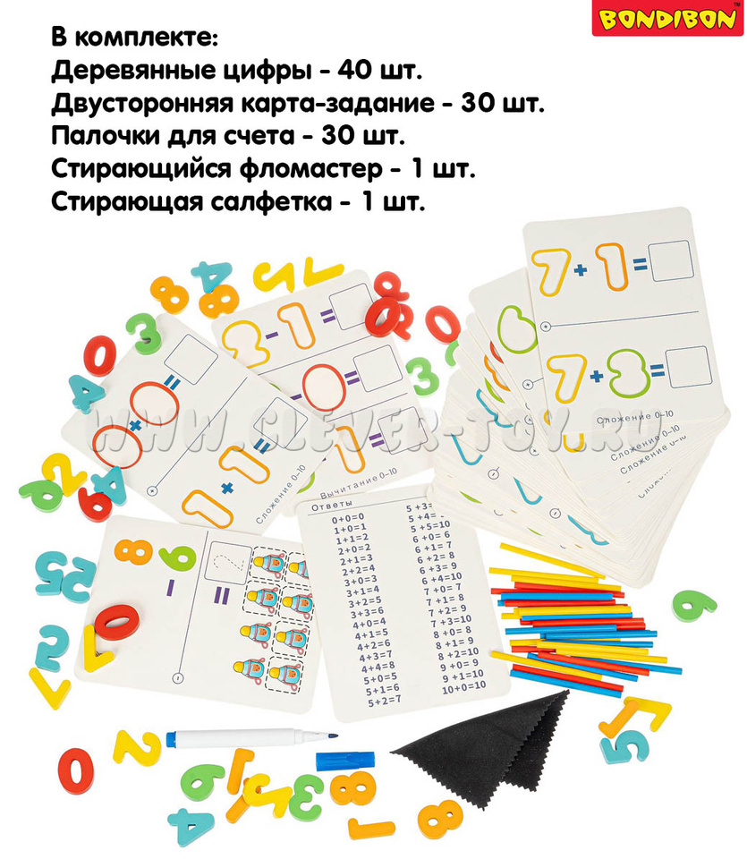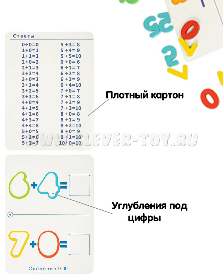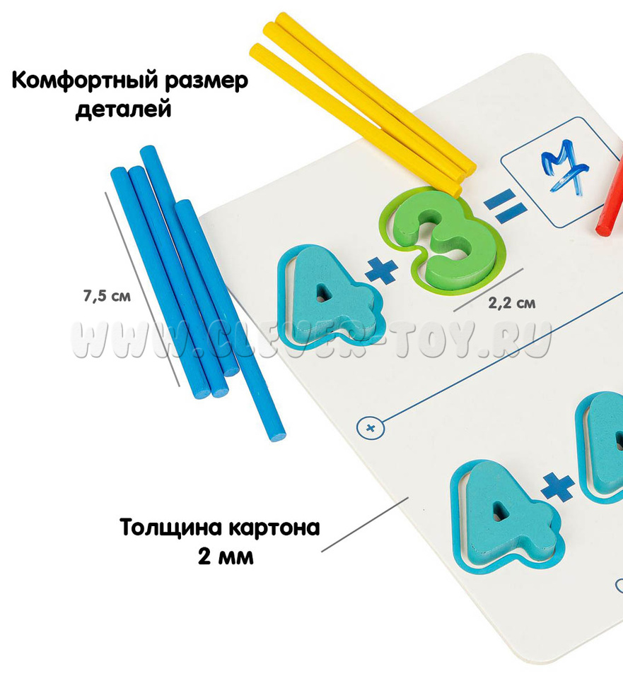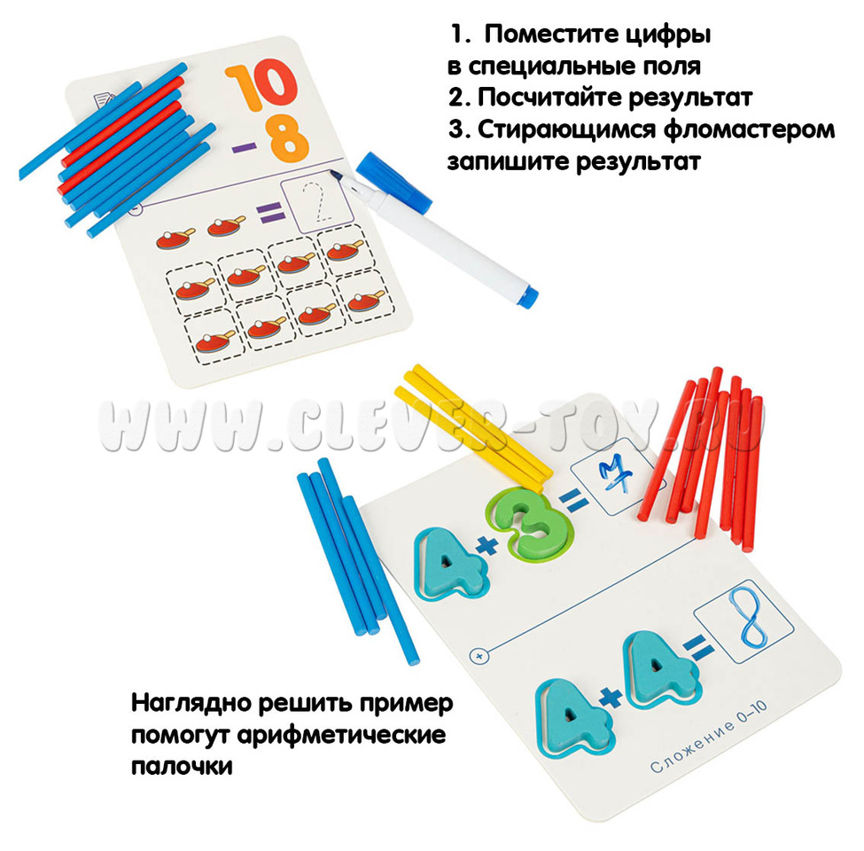 Выполняйте задания, изображенные на карточках, помещая цифры в контуры, вписывая ответы стирающимся фломастером в пустые поля. Для наглядности счета есть арифметические палочки, а для проверки - табличка с ответами. Можно устраивать соревнования, чтобы определить лучшего математика!