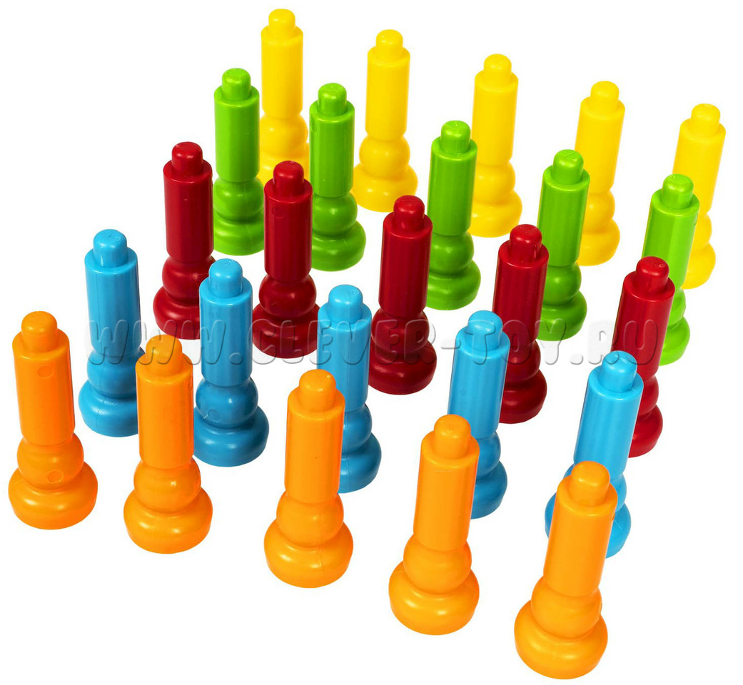 Вставляйте разноцветные колышки в отверстия мягкого коврика в соответствии комбинациям на карточках, либо придумывая свои узоры. 4 уровня сложности заданий.