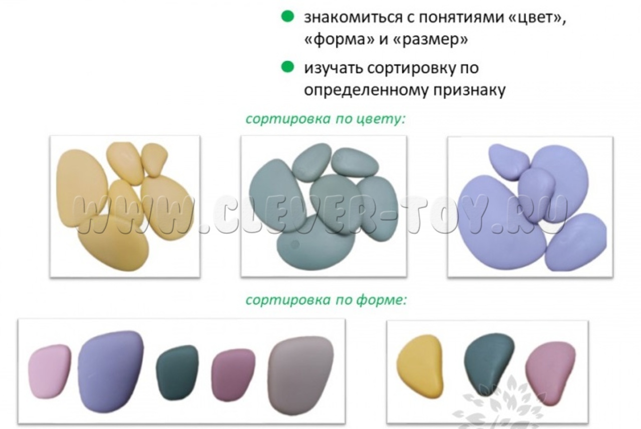 С помощью радужных камешков дети могут учиться считать и сортировать по определенному признаку, знакомиться с понятиями "цвет", "размер", "форма".