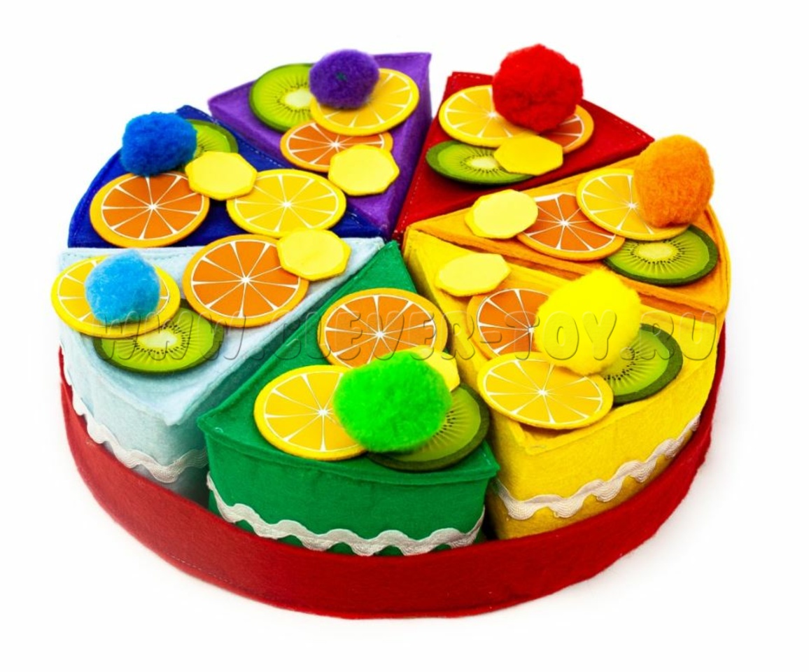 - 7 кусочков торта по цветам радуги, украшеия для торта: 7 бананов, апельсинов, киви и лимонов, 7 помпонов (зефирки) цветов радуги,