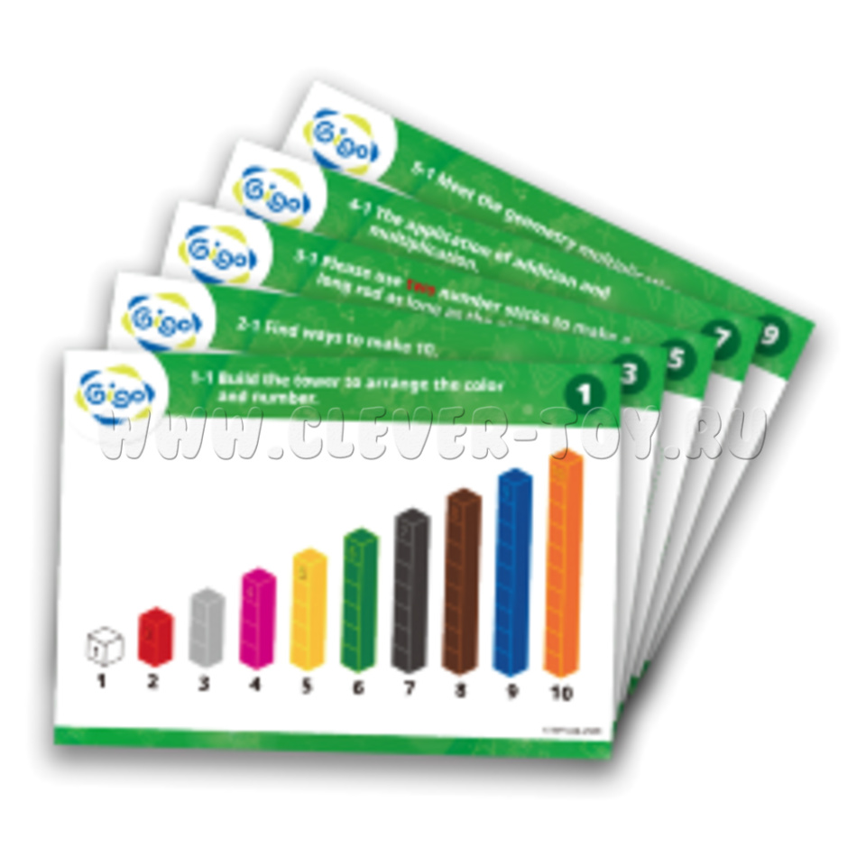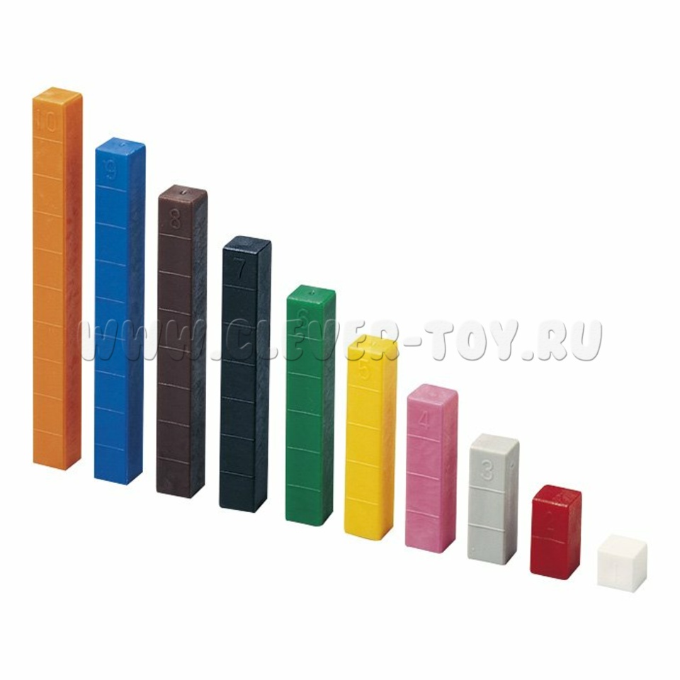 В комплекте 250 пластмассовых призм, которые отличаются по трем признакам: цвету, длине и числу, которое они обозначают. Белые 100 шт., красные 30 шт., серые 20 шт., розовые 20 шт., желтые 20 шт., зеленые 15 шт., черные 12 шт., коричневые 12 шт., синие 11 шт., оранжевые 10 шт. + 5 карточек с заданиями.