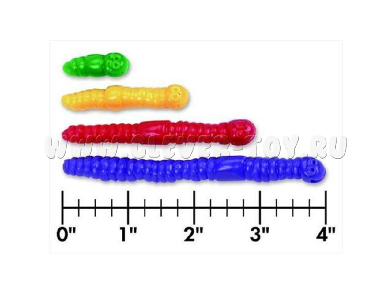 Состав набора: 72 червячка в 6 цветах и 4 размерах (1см, 2см, 3см, 4см).